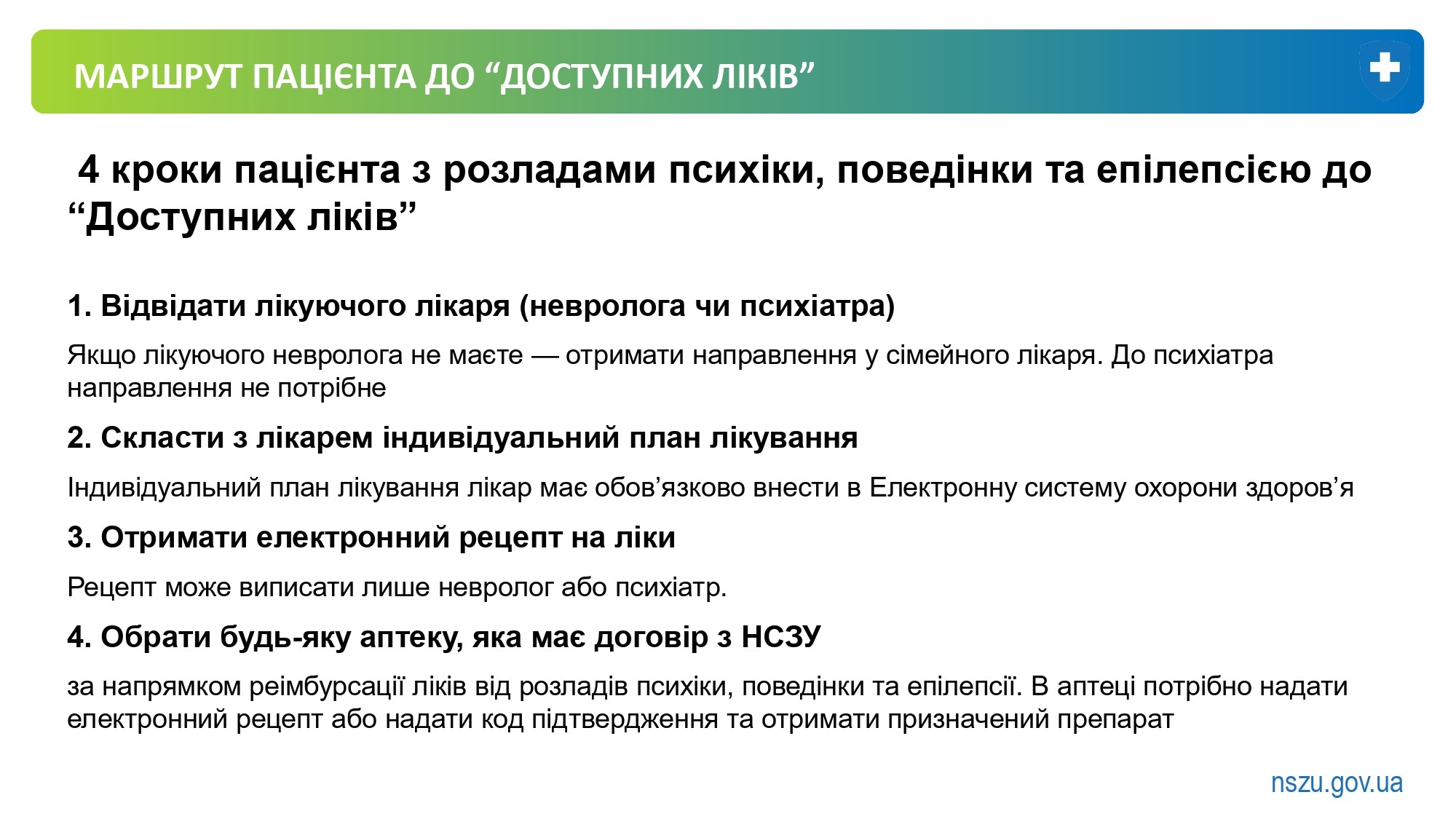 Щоб скористатися програмою “Доступні ліки” потрібно відвідати свого лікуючого лікаря – невролога чи психіатра. Це необхідно, щоб лікар створив індивідуальний план лікування і вніс його в електронну систему охорони здоров’я.
