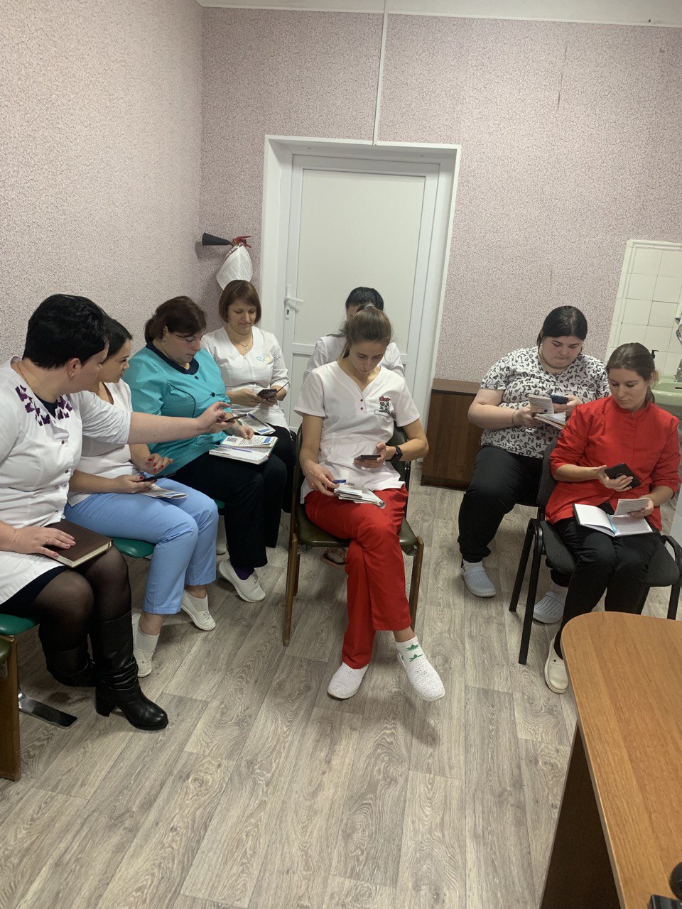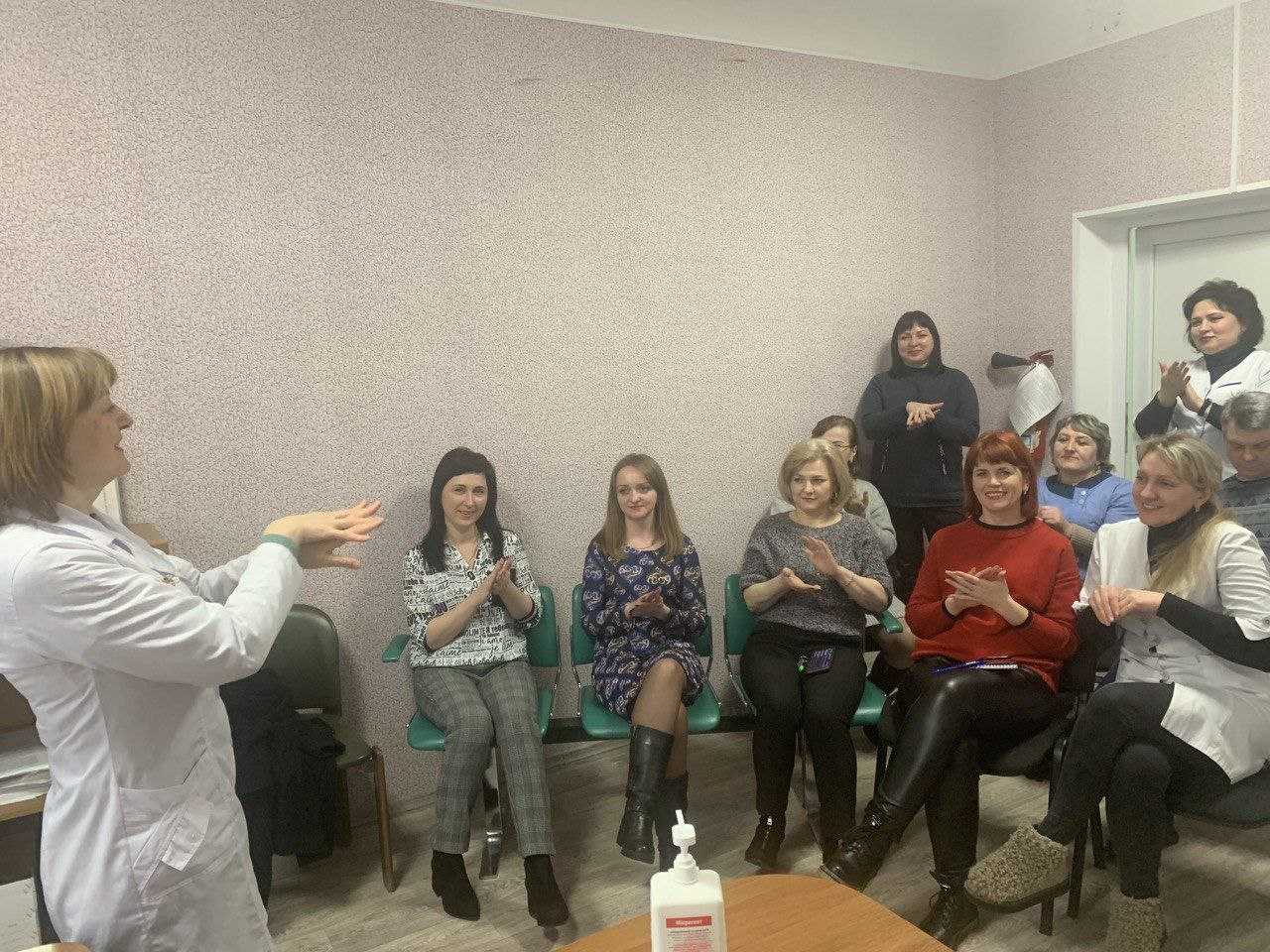 Надалі тривав практичний тренінг з відпрацюванням навичок: «Звичайне миття рук з милом», «Гігієнічна обробка рук». Наприкінці , працівники лікарні виконали тестові завдання на закріплення теоретичних знань з застосуванням додатку Google форми, що дало можливість відразу побачити помилки у відповідях та їх обговорити.